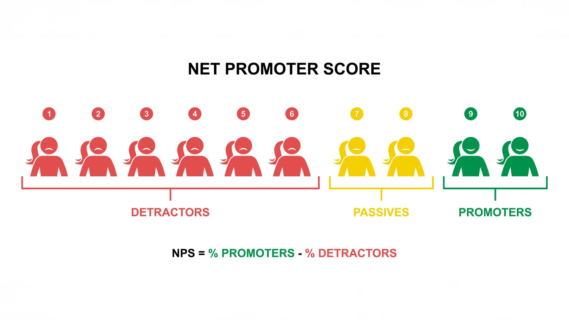 Çıkan sonuçlara göre müşterileri; 0-6 arası değerlendirenleri “Kötüleyenler”, 7-8 arası puanlayanları “Pasifler” ve 9-10 arası puanlayanları “Destekçiler” olacak şekilde tanımlar. Destekleyenlerin yüzdesinden kötüleyenlerin yüzdesini çıkartarak NPS puanına ulaşılır ve bu puan ile müşteri sadakatini ölçer. Bununla birlikte, sonuçlar -100 ile +100 arasında bir ölçekle ölçülür.